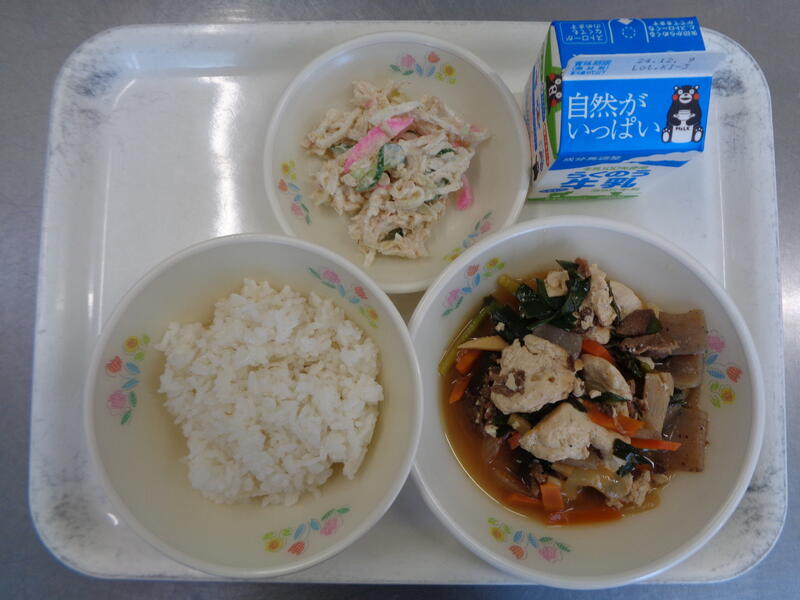 麦ご飯 牛乳 にらと豆腐の煮物 切干だいこんサラダ
