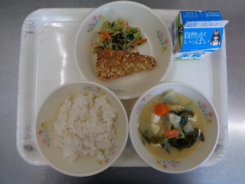 麦ご飯 牛乳 豆腐と大根のみそ汁 ほきの天玉揚げ 磯和え