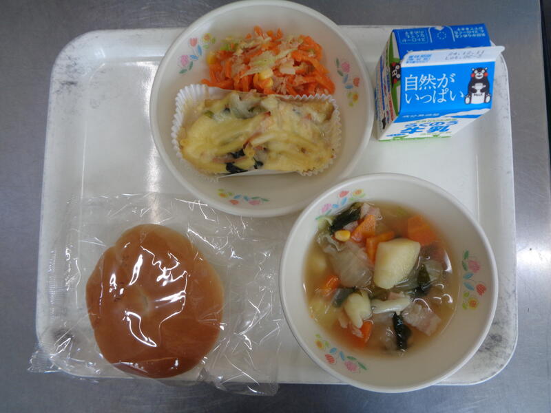 丸パン 牛乳 野菜スープ こまったさんのグラタン 人参サラダ