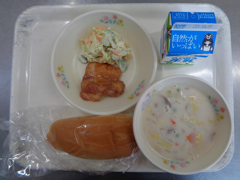 丸パン 牛乳 ジュリアンスープ 唐揚げ もみの木サラダ セレクトケーキ