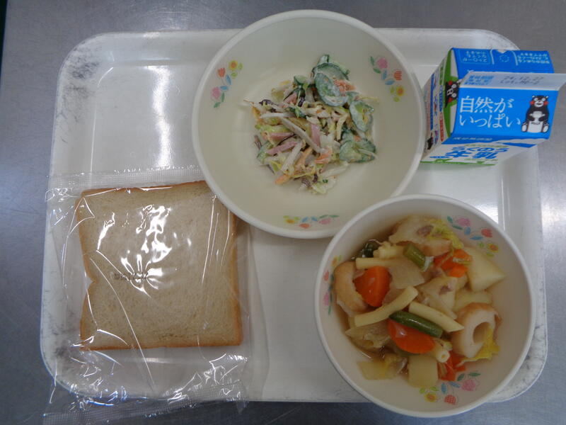 かみんこサラダには、しっかりかんで食べる歯ごたえの良い きくらげ・ごぼう・さきいか が入っています。かむことであごをしっかり動かし脳に刺激をあたえ、午後からの授業も頑張りましょう!