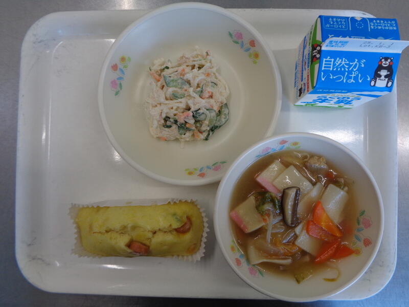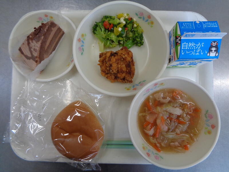 丸パン 牛乳 ジュリアンスープ 唐揚げ もみの木サラダ セレクトケーキ