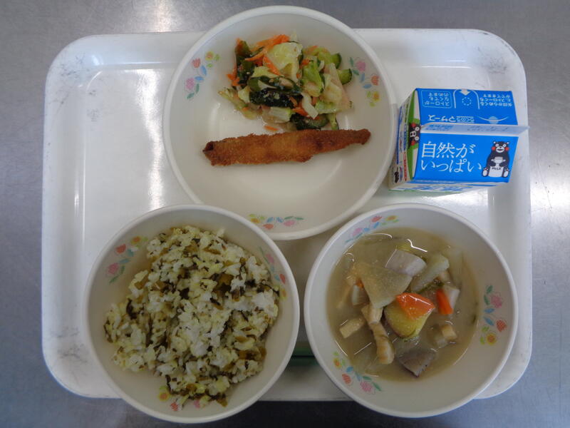 高菜めし 牛乳 根菜汁 ししゃもフライ きゃべつのごま酢和え