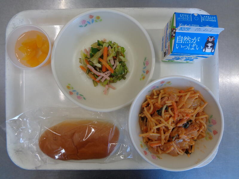 ミルクパン 牛乳 トマトクリームスパゲッティ 茎わかめのサラダ ゼリー