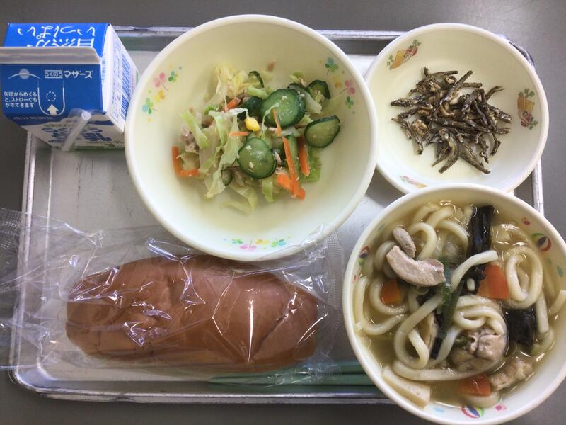 ごもくうどん ツナサラダ いりこナッツ ミルクパン