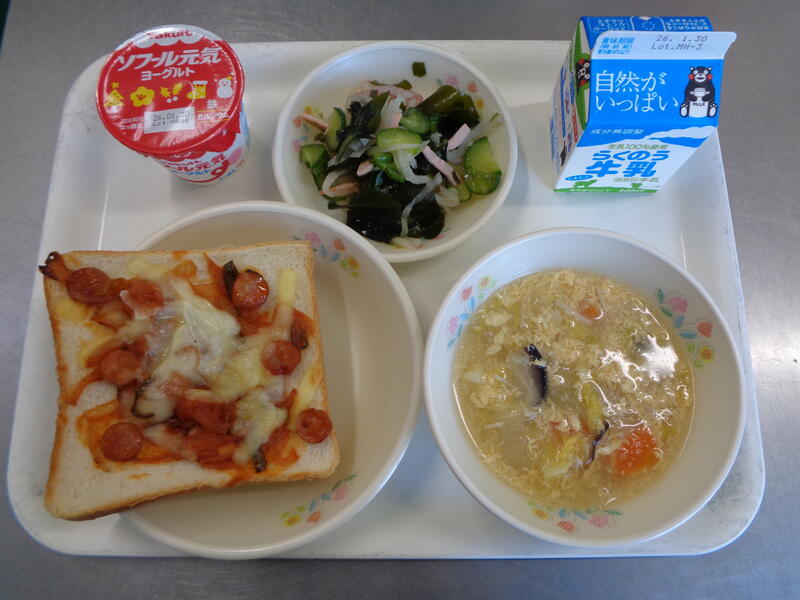 ピザトースト 牛乳 じゃが芋と卵のスープ 海藻サラダ ヨーグルト
