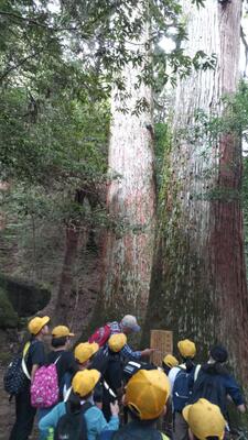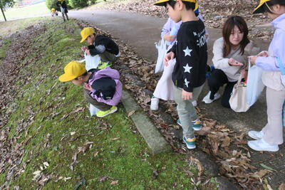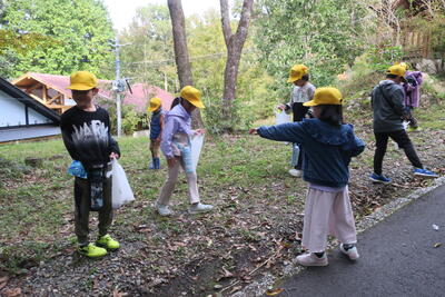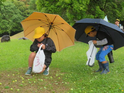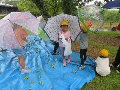 そのような時期に、小雨の中ではありましたが1・2年生はホイホイ広場に梅ちぎりに出かけました。