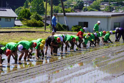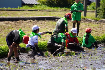 今年は湯山の田んぼをお借りして、5・6年生が田植えを行いました。