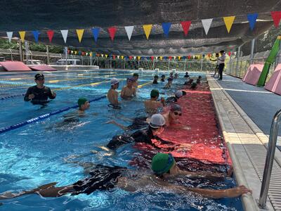 本校は、もともと中学校の施設を使っているため、低学年にとっては深いプールしかありません。