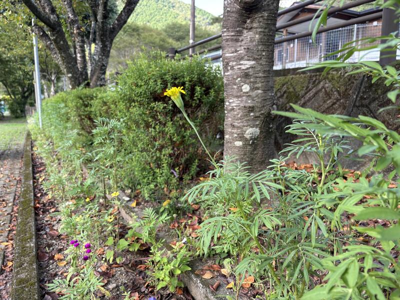学校の周り、特に運動場の外側の道路沿いのイチョウ並木が、今、まさに見頃を迎えています。黄金色に染まった葉が風に舞い、道路脇には鮮やかな黄色い絨毯が敷き詰められたような美しい光景が広がっています。子どもたちは、この季節の移り変わりを感じながら登校しています。