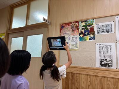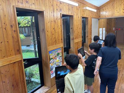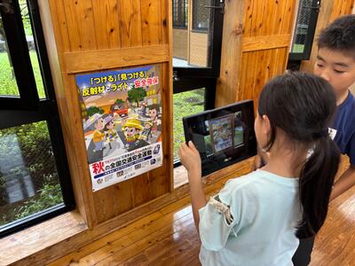 また、事件や事故の現場で身を守るための防刃チョッキを着させてもらう体験もありました。「うわっ、重い!」「これを着て走るなんてすごい!」と、その重みから、命を守る仕事の責任の重さを肌で感じているようでした。タブレット端末を使って、学んだことをしっかり記録に残す姿も頼もしい限りです。