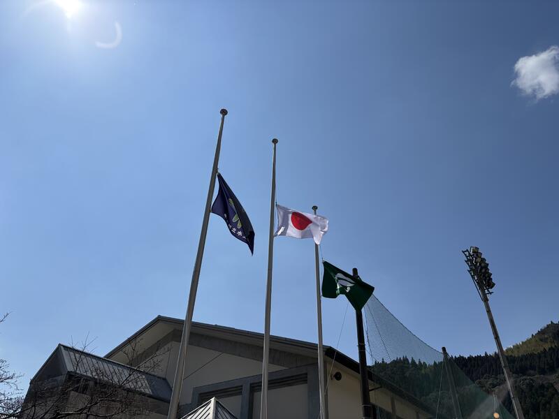 水上学園の校庭には、青空を背に半旗を掲げました。国旗、村旗、そして校旗。少し低い位置で風に揺れるその姿は、震災で亡くなられた多くの方々への深い弔いと、忘れてはならない記憶を私たちに示しています。
