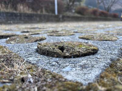 地面の透水ブロックにある丸い穴。そこにある苔や土が、霜柱の力によってぐぐっと押し上げられ、まるで地面から浮き上がっているようです。自然が作り出すこの不思議な造形に、子どもたちも興味津々。寒さの中にも、こうした小さな発見や驚きが隠れているのですね。