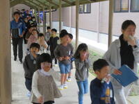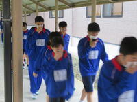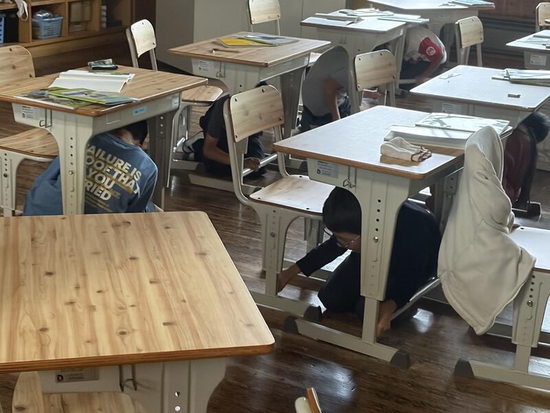 緊急地震速報の合図とともに、子どもたちは机の下に身を隠し、頭部を守る行動をとりました。その後、教員の指示に従い、静かに、そして素早く体育館へ避難しました。話し声がまったく聞こえないほど、全員が真剣に訓練に取り組み、「自らの命を守る避難」をすることができました。
