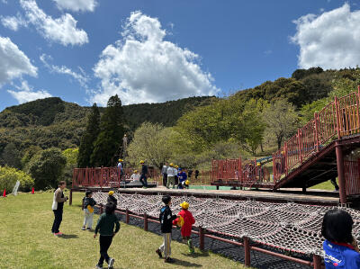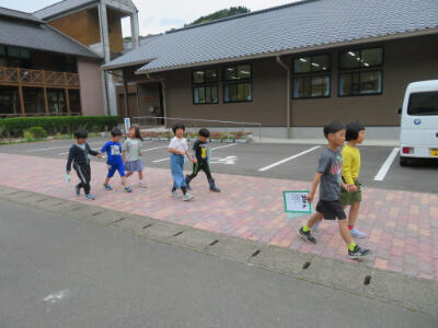 村営体育館で歓迎行事を行い、お弁当を食べた後、ほいほい広場まで歩いて行きました。