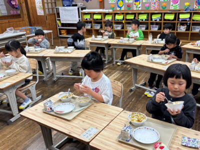 お昼には待ちに待った初めての給食。今日のメニューはみんな大好きなカレーライスでした。