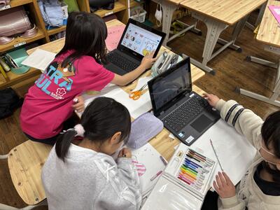 二年生は今、明後日の授業参観で行う「発表会」の準備に夢中です。黒板には「はっぴょう会にむけてじゅんびしよう」の文字。その横には「できるようになったよ」「じょうずになったよ」「二年生だいすき」といった、子どもたちの真っ直ぐな言葉が並んでいます。床に大きな模造紙を広げてプログラムを書く子、タブレットでイラストを調べながら招待状や小道具を丁寧に作る子。どの子も「自分たちの成長を伝えたい!」という意欲に溢れています。