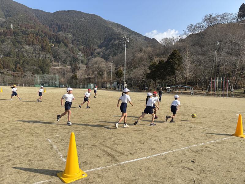 2月中旬とは思えない、4月上旬並みのあたたかな日差しが運動場を包み込みました。絶好の体育日和となった2時間目、3・4年生たちが元気にサッカーの授業に取り組んでいます。