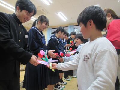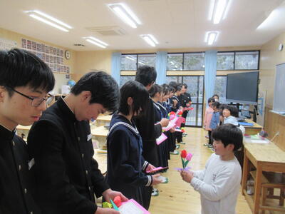 プレゼントを手渡す1年生の姿は、1年前とは比べものにならないほど頼もしく、その成長ぶりに9年生も思わず目を細めて、とびきりの笑顔で応えていました。