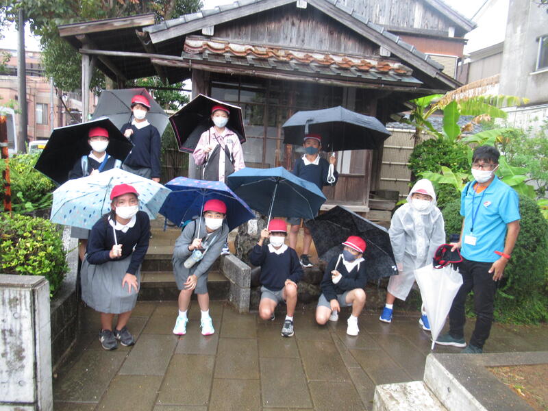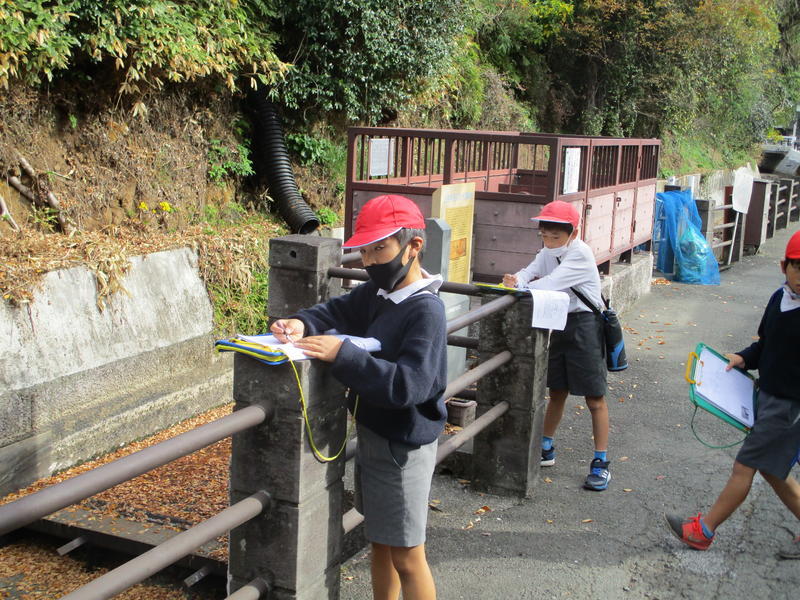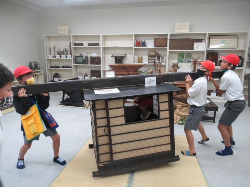 4年生は、歴史文化伝承館の見学と周辺の散策に出かけました。歴史文化伝承館では、展示してある遺物や昔の道具に興味津々で、係の方に質問をする姿も見られました。昔の人が使っていた駕籠は実際に乗ったり担いだりしても良いと言われましたので、実際に乗ったり担いだりという経験をしていました。また、大きな水車や石橋など大津町の歴史を実際に見て、昔の人の知恵に思いを馳せることができました。