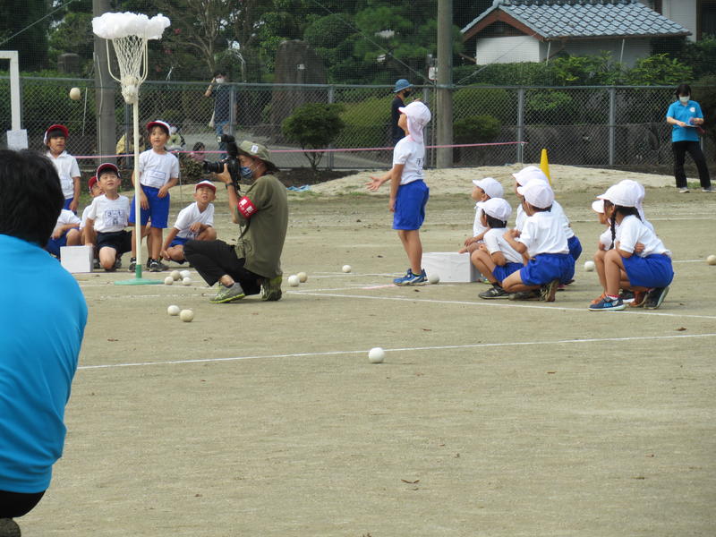 人と人との距離を保ち、密を避けるための特別な玉入れ。一人3個ずつ順番に投げるという斬新なルールでしたが、新しい運動会の中ではこのルールも「あり」だと思いました。担任の先生方のアイデアです。