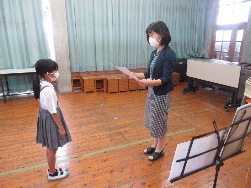 集会では、校長からの話の後、養護教諭の河内先生から新型コロナウィルス感染防止について再度話をしていただきました。子どもたちと職員全員で、学校での感染防止に努めていきたいと思います。また、前回から校歌斉唱の伴奏を子どもたちにお願いしています。チャレンジしたい子どもたちには、どんどんチャレンジしてほしいと思っています。