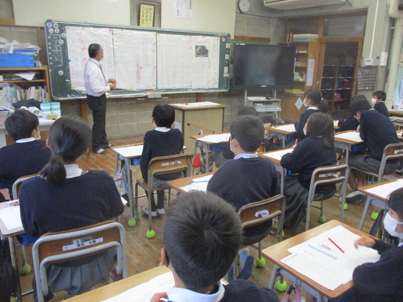 今年度、護川小学校では、学力向上のための様々な取組をしています。その一環として、教務主任の二殿先生のお父様、二殿一身先生にゲストティーチャーとして来ていただきました。5年生の子どもたちは、二殿先生のパワーに圧倒されながらも、そのスピードに必死について行こうとする意気込みが感じられました。やる気溢れる5年生の姿に二殿先生も感心されていました。