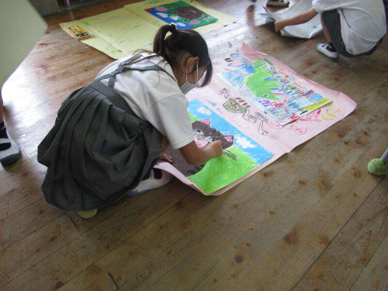 のびのびと書いてほしいので、今回は、床の上に紙を敷いて描いていました。ゴッホ画用紙の画面からはみ出しても良いように下にもう一枚紙を敷いて描いていました。その様子がとても楽しそうで、迫力満点の絵ができあがっていました。