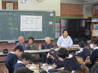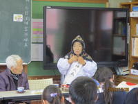 12月6日(金)3・4時間目6年生は、平和学習の一環として、護川小学校区在住の3名の方々に来校いただき、戦時中の様子の聞き取りを行いました。豊岡ミスエさんには、「戦時中の『食』について」、杉水清子さんには、「戦時中の『見送り』について」、豊岡吾朗さんには、「戦時中の学校生活、くらしについて」それぞれお話をしていただきました。子ども達は、戦争という困難に立ち向かい、たくましく生きてきた生き方を学び、これからの自分の生き方を見つめる貴重な学習の機会となりました。3名の皆様には、当時の着物等を準備下さり、お話しい