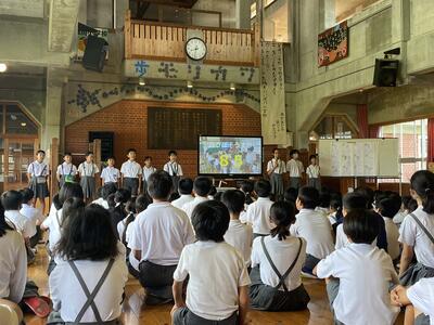 選ばれたキャラクターを企画委員会が一つ一つ紹介。キャラクターに込められた思いを聞くことで、この企画に対する子どもたちの思いがきっと伝わったと思います。いよいよ明日から投票がスタートします。どのキャラクターが選ばれるのか、結果が今から楽しみです。これからも、委員会や児童集会を通して、「自分たちで学校を作っていく」という思いを育てられればと思います。