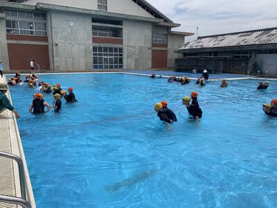 6月9日、晴天の中プール開きを実施することができました。1年生にとっては小学校生活初めてのプール。6年生と一緒に準備体操をし、背中におんぶをしてもらいながら、大きいプールを満喫することができました。