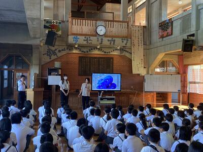 8月28日夏休み明けの最初の1時間目に夏休み明け集会が行われました。最初は、新しく来た先生の紹介がありました。産休の河内先生に代わり赴任された森先生です。養護教諭として、子どもたちと心と体の健康について指導していただきます。