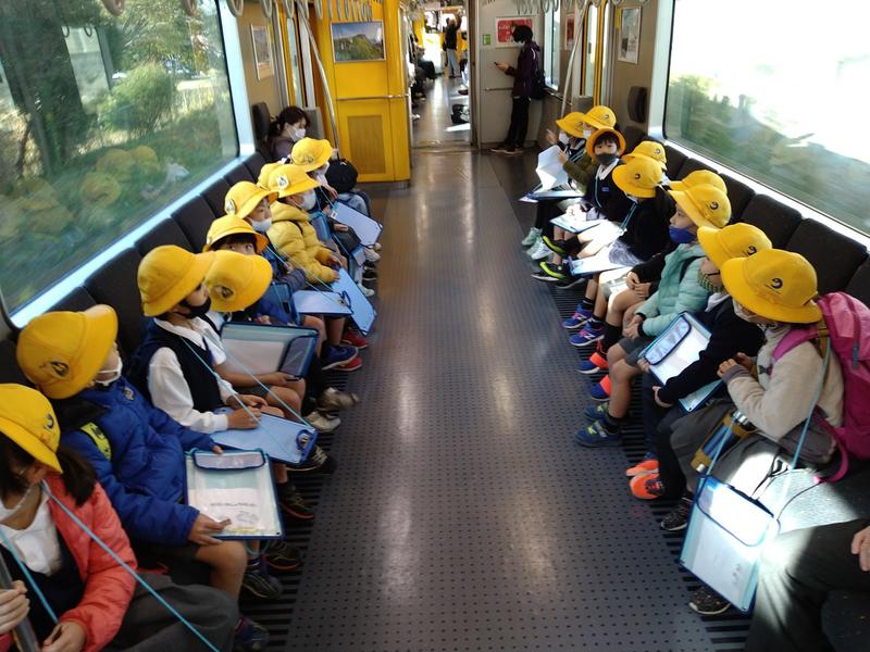 1年生は、空港とJRの駅に出かけました。空港では、外部の方との接触をできるだけ避けるために、本来の空港ではなく、飛行機の駐機場の見学をしました。間近で飛行機やヘリコプターを見るというのはなかなかできない経験ですので、子どもたちもわくわくしながら話を聞いていたようです。ヘリコプターの座席に乗せていただくという貴重な経験もさせていただきました。また、JR体験では、大津駅から光の森駅まで実際にJRに乗車しました。切符もそれぞれ自分で買って、電車に乗り込みました。車内では、写真の通り、きちんと座って、とても立派な1年生でした。最後に杉水公園でお弁当を食べ、そこから歩いて学校に戻りました。たくさんのことを学んだ1年生でした。
