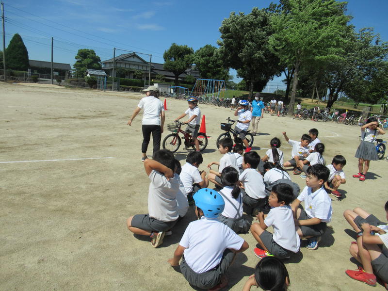 先日、全学年で交通教室が行われました。1年生と2年生は、道路の歩き方や横断歩道の渡り方、3年生から6年生は道路での自転車の乗り方や横断歩道の渡り方について学習をしました。役場から借用した信号機を運動場に設置し、実際の道路と同じようなコースを作って実際にやってみましたが、どの学年も真剣に取り組むことができました。