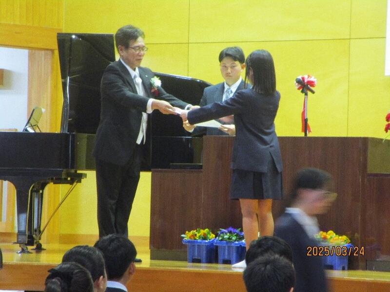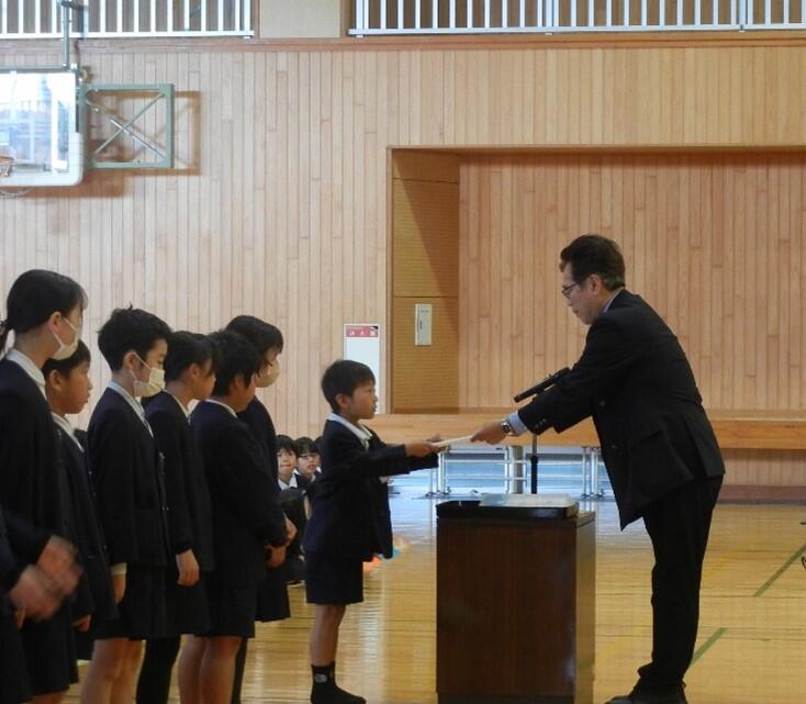 3月25日(火)に修了式が行われました。(6年生は3月21日に実施しました。)修了式は1年間の頑張りを称え、成長を実感する時間です。各クラスの代表児童が、校長先生から修了証を受け取りました。