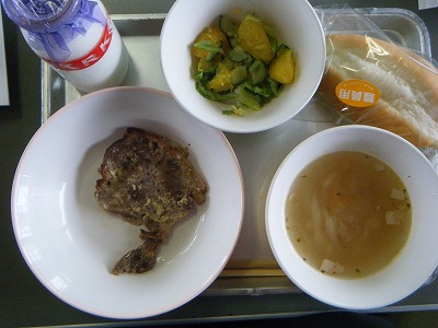 ソフトフランスパン 豚肉のマスタード焼き オニオンスープ 甘夏サラダ 牛乳