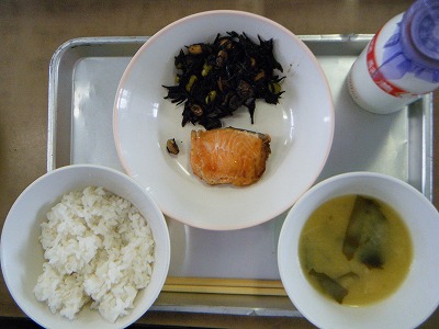麦ごはん 大豆の磯煮 鮭の塩焼き みそ汁 牛乳