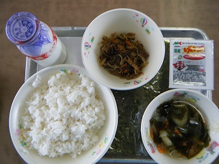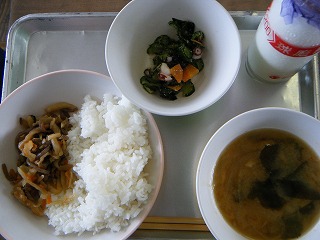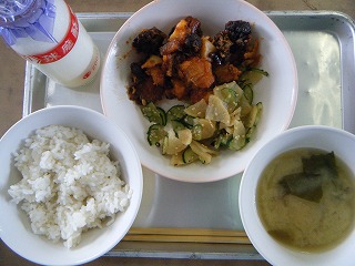 赤だしみそ汁で汗で流れた塩分を補給します。たこのすのもので疲れもとれる給食です。