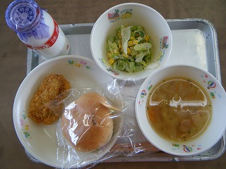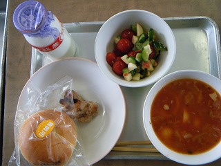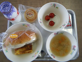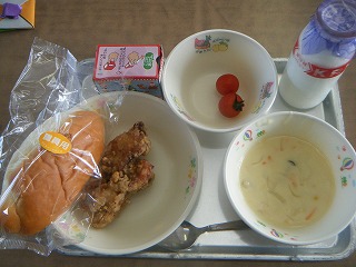 ミルクパン 手作りフライドチキン ミニトマト コーンスープ ケーキ 牛乳