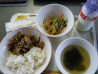 スタミナ丼 ナムル わかめスープ デザート 牛乳