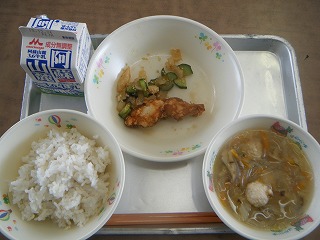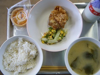 麦ごはん 鶏のから揚げ 和風サラダ みそ汁 デザート 牛乳
