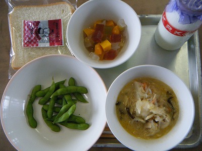 食パン トマトタイピーエン 大豆チョコ 枝豆の塩ゆで キラキラフルーツカクテル 牛乳