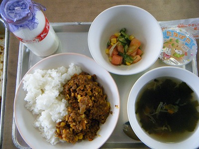 キーマとは、ひき肉、または細切れ肉を意味するそうです。ドライカレーとの違いは、汁気があるということだそうです。給食で料理のお勉強もできます。