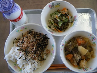 麦ごはん 肉じゃが 手作りふりかけ 切り干し大根の酢のもの 牛乳