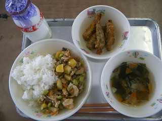 セルフ栗ごはん 小いわしフライ つみれ汁 牛乳