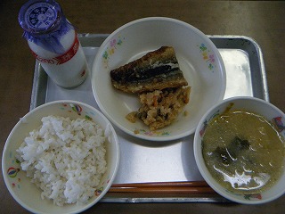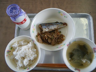 麦ごはん さんまのかば焼き いりうの花 みそ汁 牛乳