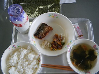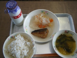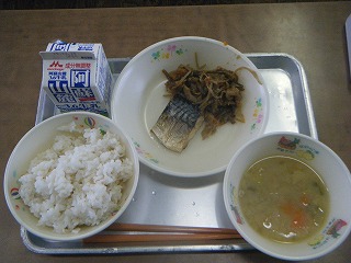 麦ごはん 牛乳 鯖の塩焼き かわりきんぴら さつま汁