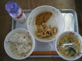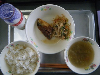 麦ごはん 魚のみそ焼き ピーナッツあえ 塩豚汁 牛乳