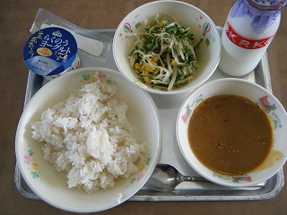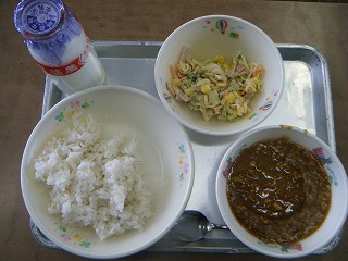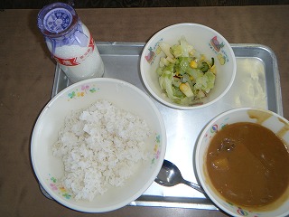 ビーフカレーライス 水菜のサラダ ヨーグルト 牛乳