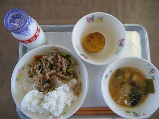 麦ごはん じゃがいものきんぴら たこのカレー揚げ すまし汁 牛乳